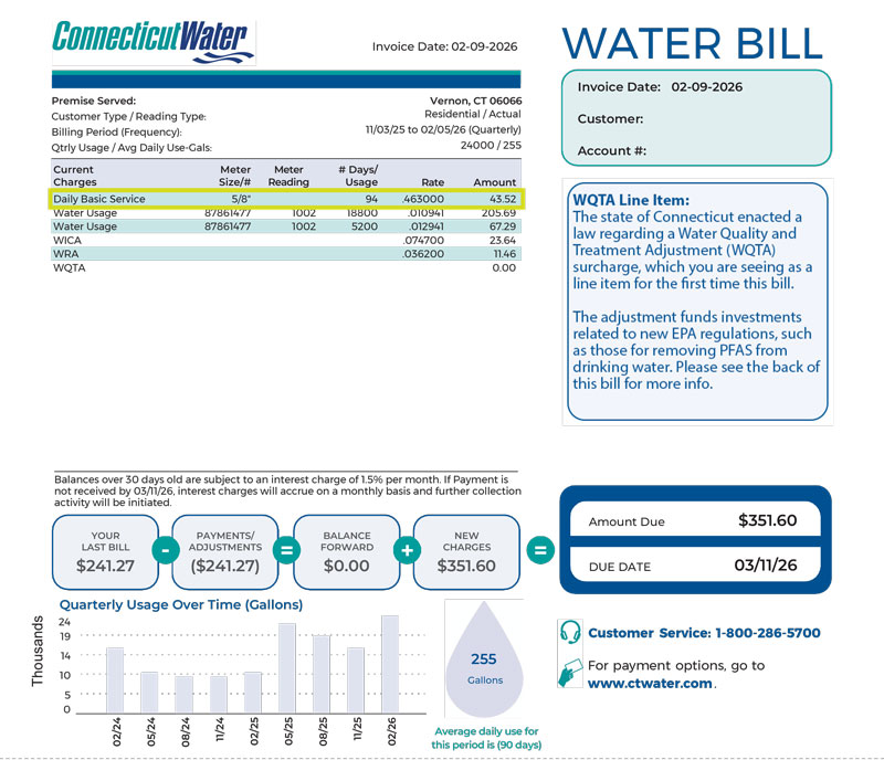 For most of our customers with a consumption history, Connecticut Water will look at your prior year’s usage during the same time period to determine an estimated usage for your home.