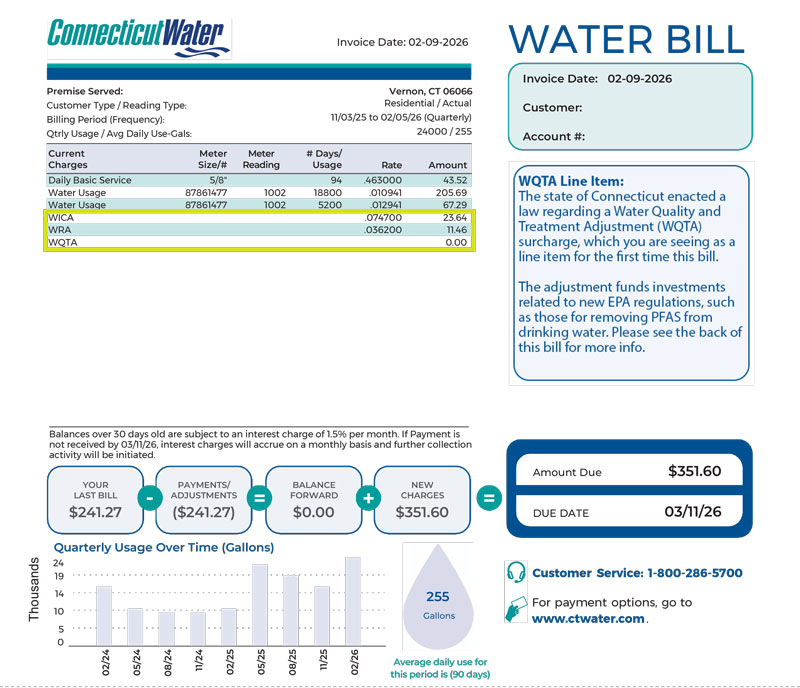 - The Water Quality & Treatment Adjustment (WQTA) recovers the cost of implementing treatment for new EPA regulations, such as those for removing PFAS from drinking water, between rate cases. This charge may be adjusted every 12 months.